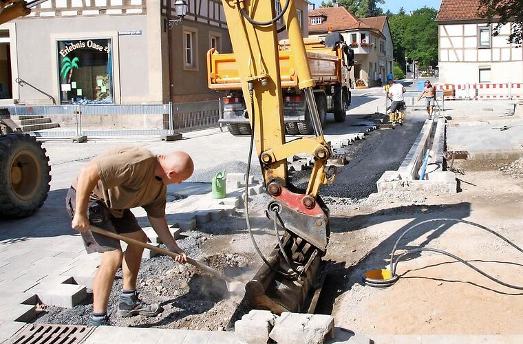 Andreas Euring von der Firma Zehe ist der Chef auf der Münnerstädter Baustelle. Mit dem Ablauf ist er zufrieden. Das Wetter habe bis auf zwei Regentage gut gepasst. Am Freitag waren weitere Pflasterarbeiten angesagt. Der Brunnen, so Euring, werde als letzter fertig. Mitte der nächsten Woche will die Firma mit dem Rollatorweg beginnen.Der Münnerstädter Alois Keller kommt täglich an der Baustelle vorbei und er findet schon jetzt Gefallen an der neuen Platzsituation.