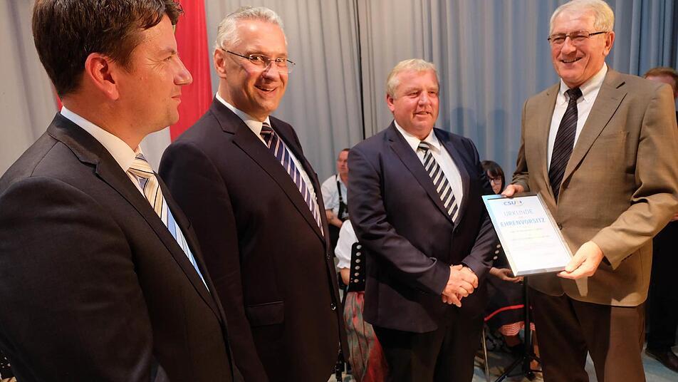 Die Anwesenheit von Staatsminister des Innern Joachim Herrmann beim Jubiläumsfestakt des CSU-Ortsverbandes Maßbach nahm Thundorfs Bürgermeister und CSU-Ortsvorsitzender Egon Klöffel, zum Anlass, seinem Vorgänger im Amt, Anton Bauernschubert, die Ernennungsurkunde als künftiger Ehrenvorsitzender durch den Minister überreichen zu lassen.