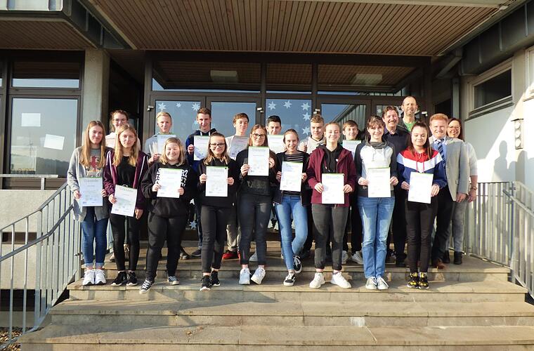 Als Höhepunkt der Feier wurden 17 Neuntklässler mit Urkunden und Anstecknadeln für ihren zweijährigen Einsatz geehrt. Ab Januar bekommen die Schülerlotsen dann Unterstützung durch die inzwischen schon neu ausgebildeten Siebtklässler.