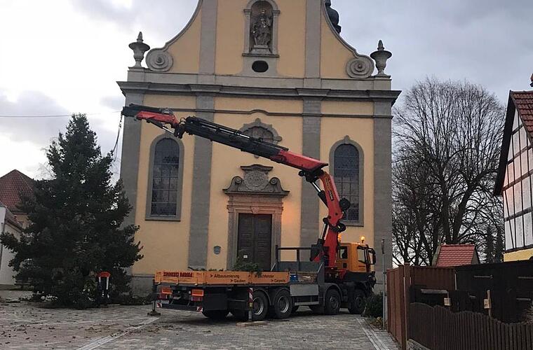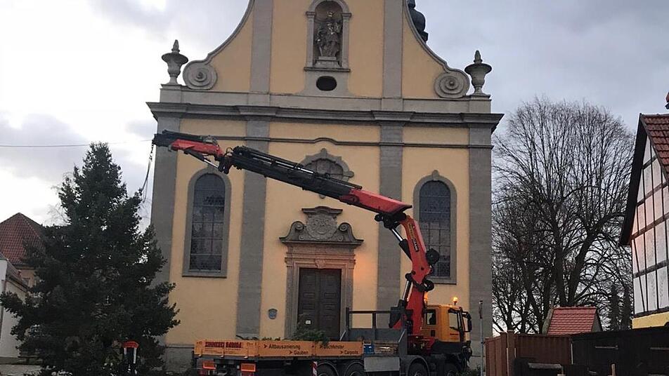 Die Freiwillige Feuerwehr Großwenkheim hat am Wochenende am Dorfplatz den Christbaum aufgestellt. Gespendet wurde der Baum von Walter Zinsler. Durch die Unterstützung der Zimmerei Radina, aus Großwenkheim, konnten die Helfer den Baum am Freitag bei Zinsler fällen, transportieren und schlussendlich aufstellen. Am Samstag wurde dann mit Unterstützung der Drehleiter der Feuerwehr Münnerstadt die Beleuchtung angebracht. red