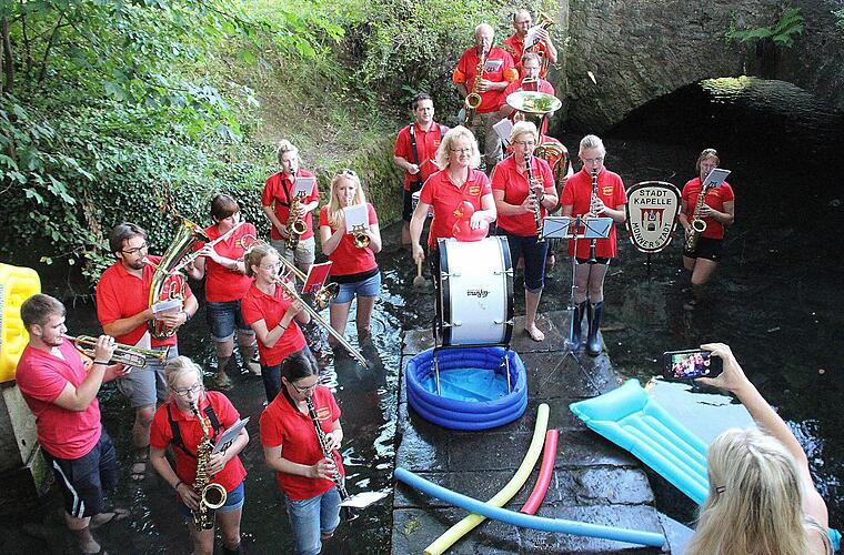 Nun aber krempelten 16 aktive Mitglieder der Stadtkapelle Münnerstadt die Hosen hoch, zogen Schuhe und Strümpfe aus und dafür Gummistiefel, Badelatschen oder Schwimmflossen an. Besonders Unempfindliche stapften einfach barfuß ins Wasser, alle mit ihren Musikinstrumenten, denn schließlich wollten sie ein kurzes Konzert im Wasser geben, das mittels Handy gefilmt und bei YouTube ins Internet gestellt werden musste. "Schön, dass trotz der Ferien so viele Musiker gekommen sind, um bei diesem Spaß mit dabei zu sein", freute sich die Vorsitzende Erika Pascher.
