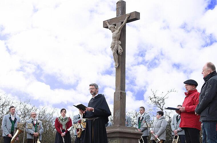Am Fußweg von Münnerstadt nach Fridritt und Maria Bildhausen steht seit mehr als 200 Jahren ein Flurkreuz. Der Rhönklub-Zweigverein Münnerstadt hat es nun, obwohl es auf städtischem Grund steht - auf Althauser Gemarkung - und damit der Stadt Münnerstadt gehört, für einen vierstelligen Betrag sanieren lassen. Dies sagte der Vereinsvorsitzende Egbert Haut bei der Segnung des Kreuzes in Anwesenheit zahlreicher Gäste. Mit dabei war auch der Musikverein Fridritt unter der Leitung seines Vorsitzenden Raimund Back, der der Feier den würdigen musikalischen Rahmen gab.