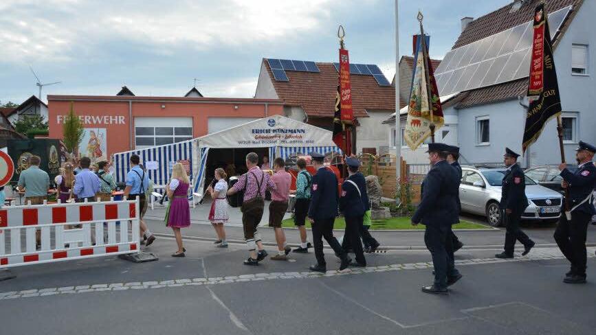 Nach dem feierlichen Gottesdienst in der Kirche ging es im Festzug zum Feuerwehrhaus, wo Pfarrer Joachim Pennig und Pater Markus Reiß gemeinsam das Gebäude einweihten.