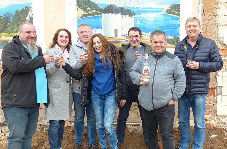 So musste es denn für einen letzten Ouzo, kredenzt von Ilias, vor einem idyllischen griechischen Wandbild aus einem noch stehenden Mauerstück der ehemals gemütlichen Speisegaststätte reichen.