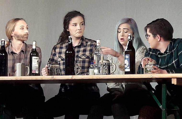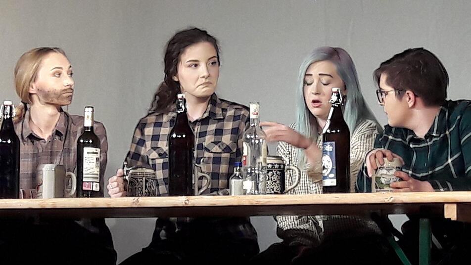Ein Wechselbad der Gefühle blieb im ersten Teil des Stücks nicht aus. Denn Erstens war der Teufel ein Weib und Zweitens zeigte sich Leipzigs Auerbachs Keller ehr als Rhönkneipe, denn das Kreuzberglied ("Grüß mir die Heimat..") hielt feuchtfröhliche Einkehr in den Urfaust. Am Wirtshaustisch hielten sich Eileen Herterich (Frosch), Kim Süssner (Brander), Saskia Bauer (Siebel) und Amelie Dippold (Alten) als überzeugende Trunkenbolde fest.