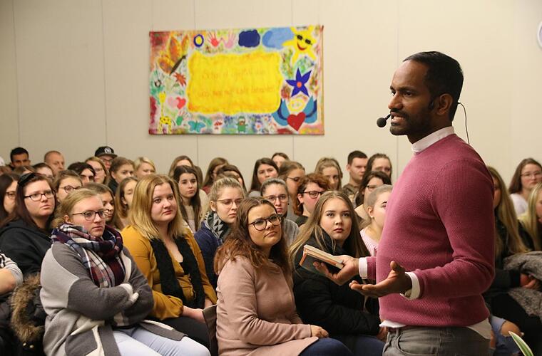 Laura Schmidt hat Umeswaran Arunagirinathan bei der interkulturellen Woche in Bad Kissingen erlebt. Die Lehrerin in der Fachakademie für Sozialpädagogik und der Fachschule für Heilerziehungspflege am BBZ war begeistert. Sie hat seine Rede zum Gedenktag für die Opfer von Flucht und Vertreibung unter anderem vor Angela Merkel und Horst Seehofer gesehen. "Es ist wichtig, dass Menschen mit Migrationshintergrund in den Vordergrund treten und sagen: Wie sind hier, wir gestalten mit", sagt sie. So würden die Menschen zum Nachdenken gebracht, Vorurteile abgebaut. Laura Schmidt weiß genau, wovon sie spricht. Denn sie hat als gebürtige Rumänin (Siebenbürgen) selbst einen Migrationshintergrund. Gerne wollte sie Umeswaran Arunagirinathan zu einer Lesung ans BBZ holen, und dabei half der Zufall mit. Denn eine ihrer Studierenden hat als Krankenschwester mit Umeswaran Arunagirinathan im OP gestanden. Sie stellte den Kontakt her, und Schulleiter Harry Koch war auch gleich dabei. Damit möglichst viele Schüler und Studierende der sechs Schulen am BBZ dabei sein können, gab es gleich zwei Lesungen hintereinander.