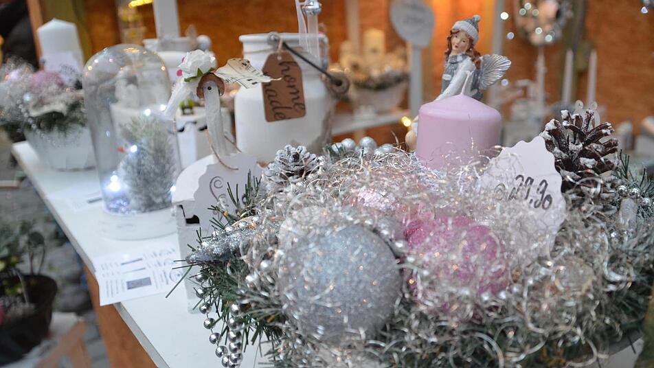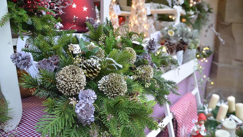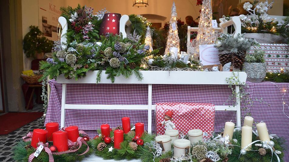 Ein paar Schritte vom Trubel im Schlosshof entfernt stehen Claudia und Gisela Kind. Vor ihnen türmen sich kunstvolle Gestecke, bunte Kränze und kleine weiße Weihnachtsbäume. "Es wird viel geguckt", erklärt Claudia Kind. "Die Leute freuen sich, dass es schön dekoriert ist und dass sie die Stimmung mit nach Hause nehmen können." Zusammen mit Bärbel Will mit ihren bemalten Schlittschuhen und Resi Hanshans, die selbst gemachte Aufstriche für die Weihnachtszeit anbietet, haben sie die kleine Nische vor dem Museumseingang entdeckt. "Der Platz ist wunderschön, wir genießen und schätzen das sehr", freut sich Claudia Kind.
