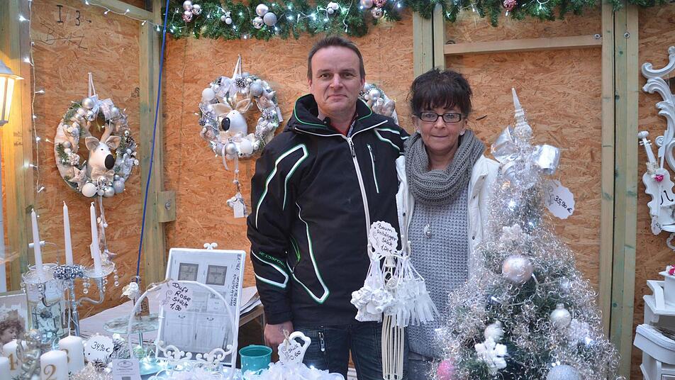Individuelles Handwerk ist aber nur ein Grund, warum Münnerstadt in den Augen vieler Händler und Besucher aus den Weihnachtsmärkten der Region heraussticht. "Wir kennen hier schon die halbe Stadt, obwohl wir erst zum dritten Mal hier sind", sagen Daniela Koenig und Marco Schmitt. Die beiden kommen aus Brendlorenzen und haben eine Holzhütte im Schlosshof ergattert - mittendrin und komplett in Weiß. Weiße Christbaumkugeln, weiße Adventskränze, weißes Lametta. Für sie liegt der Zauber von "Weihnachten im Schloss" in der familiären Atmosphäre und darin, dass kaum ein Weihnachtsmarkt ein passenderes Ambiente als Schloss und Heimatspielhaus zu bieten hat. "Es sieht einfach klasse aus", schwärmt Daniela und Marco ergänzt: Es sei einfach kein "Fress- und Saufmarkt", wie man ihn sonst oft in der Umgebung fände.