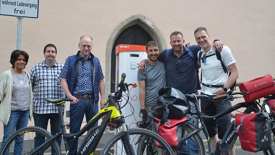 Zwei von diesen Helfern sind die Kleinwenkheimer Tanja und Ralf Verholen. Als Telekom-Mitarbeiter - das Unternehmen ist einer der Sponsoren der Reise - kennt Ralf Verholen Maximilian Semsch schon etwas länger und hat es sich nicht nehmen lassen, ihn nach Münnerstadt einzuladen. Mit seinem Kollegen Thomas Eckert hat er den Abenteurer ein paar Kilometer nach Münnerstadt begleitet. Dort warteten schon Bürgermeister Helmut Blank, Kultourismus-Chefin Inge Bulheller und Museumsleiter Björn Hein, um dem E-Biker die Stadt zu zeigen.