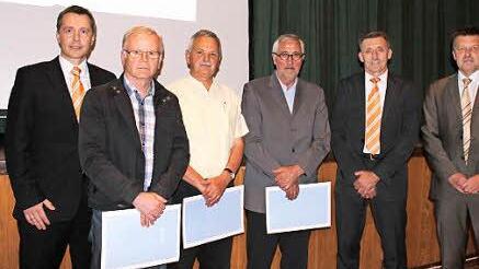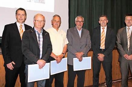 Sie bekamen vom Aufsichtratsvorsitzenden Geus die Ehrenurkunde des Genossenschaftsverbandes Bayern für ihre langjährige Tätigkeit verliehen. Als Nachfolger in den Aufsichtsrat wurde der Bürgermeister der Gemeinde Rannungen, Fridolin Zehner, gewählt. Damit hat sich der Aufsichtsrat der Raiffeisenbank verkleinert und verfügt zukünftig über acht Mitglieder. Aufsichtsratsvorsitzender Franz Geus führte durch die Versammlung und freute sich über die Präsenz der Bürgermeister aus Maßbach, Rannungen, Poppenhausen und Oerlenbach. Bürgermeister Matthias Klement (Maßbach) sprach auch im Namen seiner Kollegen ein Grußwort.