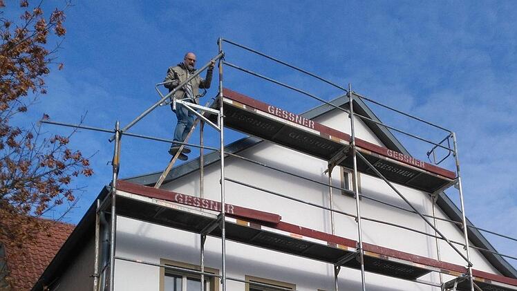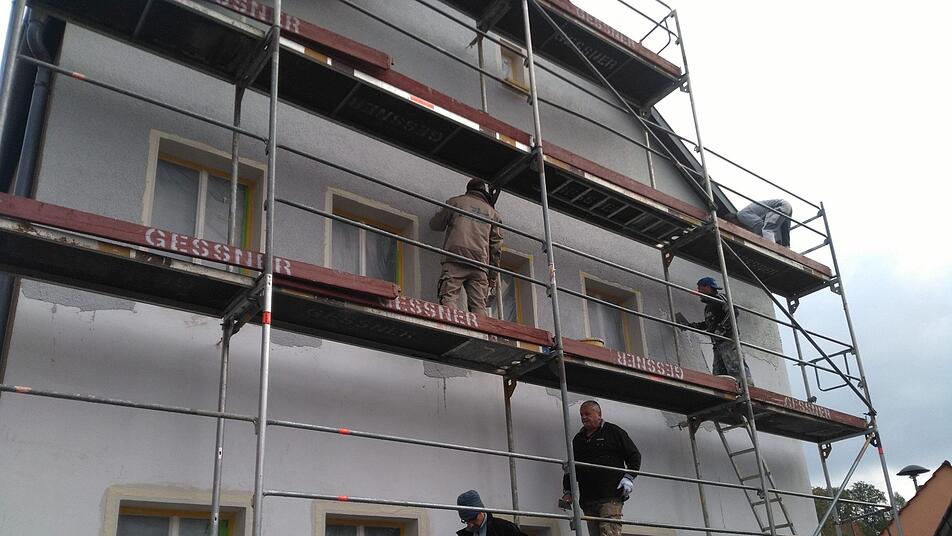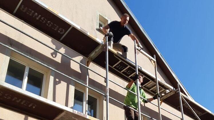 Weil aber auch das verputze Nebengebäude nicht mehr ansehnlich war, haben sich die Reichenbacher entschlossen, auch dort tätig zu werden. Schnell war ein Gerüst zusammengetragen und aufgestellt, Michael und Waldemar Gessner von der Verputzerfirma im Dort suchten die Farbe aus und stellten das Material. Ein Vorübergehender habe gesagt, dass das Haus jetzt majestätisch aussehe, erzählt Fabian Nöth, der zusammen mit dem Vorsitzenden des Sängerkranzes Reichenbach, Armin Hillenbrand, die Arbeiten koordiniert. Und tatsächlich erinnere die Farbgebung an das Münnerstädter Deutschordensschloss.