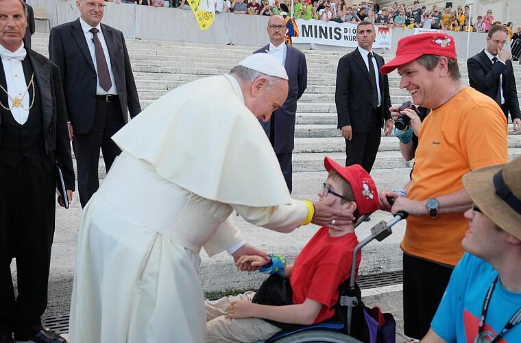 Als Rollstuhlfahrer hatte Fabian das Glück, bei der Papstaudienz ganz vorne zu sitzen und dem Papst die Hand geben zu dürfen. Fabian nahm zusammen mit seinen Eltern Maritta und Konrad Ziegler, der als Gemeindereferent in der Kurseelsorge in Bad Neustadt arbeitet, an diesem unvergesslichen Gemeinschaftserlebnis in Rom teil.