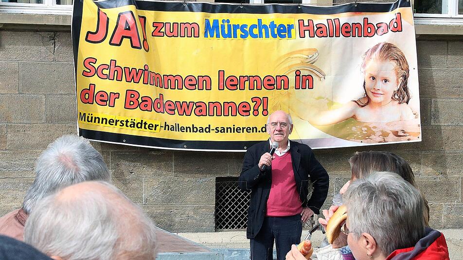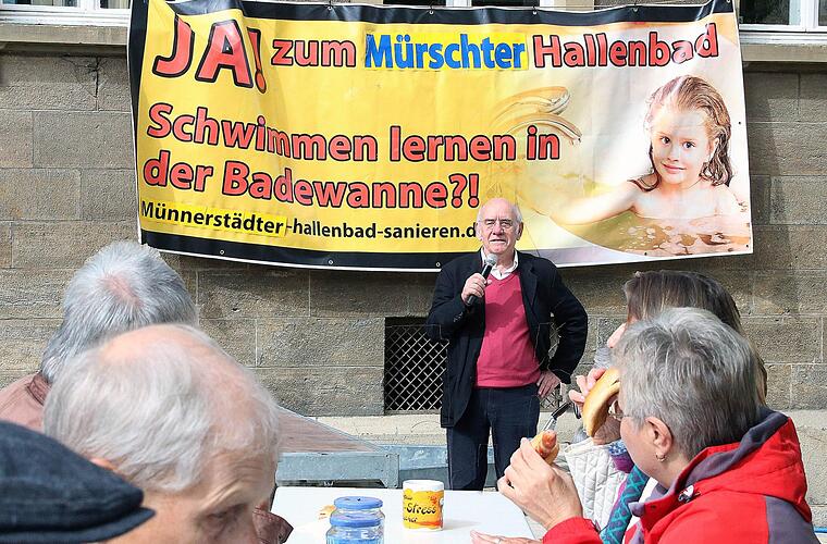 Fast schon zur Partymeile wurde der Stenayer Platz vor der Alten Aula. Der Bürgerbad-Verein hatte ein Bürgerbad-Fest organisiert. Damit auch jeder gleich sah, um was es ging, war an der alten Aula ein Plakat mit Aufschrift "Ja! zum Mürschter Hallenbad - Schwimmen lernen in der Badewanne?!" angebracht worden. Der Vereinsvorsitzende Wolfgang Blümlein konnte sich über mangelndes Interesse wahrlich nicht beklagen.