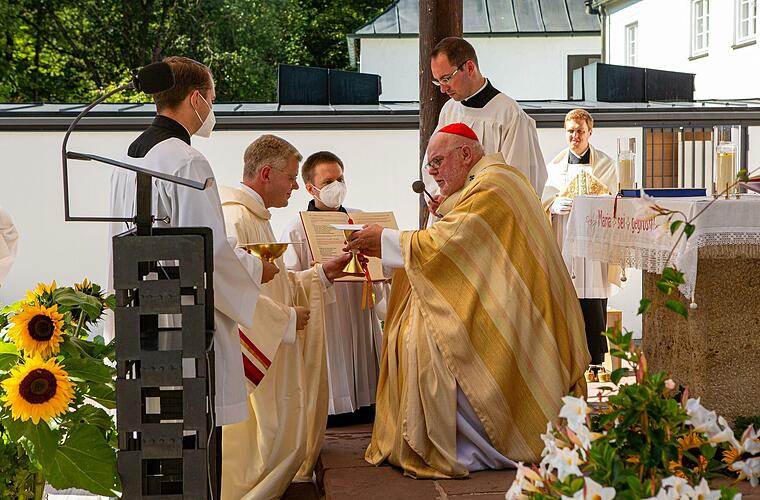 "Der Priester soll ein Mann des Trostes sein, aber nicht, indem er alle auf sich konzentriert, sondern indem er Bote und Zeichen des Trostes ist in der Eucharistie", betonte der Erzbischof von München und Freising, Kardinal Marx, beim feierlichen Gottesdienst am Freialtar der Wallfahrtskirche Maria Eich. Laut Pressemitteilung des Erzbistums zur Priesterweihe betonte der Kardinal, dass die Eucharistie als der Ort, an dem das priesterliche Leben in besonderer Weise konzentriert sei, sichtbar mache, was ein Priester sein solle: "Vorsteher der Gemeinde, aber dann doch in der klaren Orientierung an dem Weg, den Jesus geht, der bei uns zu Tisch ist, aber als einer, der bedient, der nach unten geht."