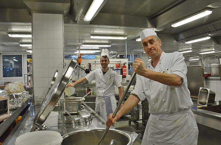 Welche Ausmaße die Verköstigung von 450 Gästen am Donnerstag für die Küche mit sich bringt, zeigen einige Zahlen. Immerhin werden 30 Kilogramm Kürbisse, 120 Kilogramm Rindergulasch, 50 Kilogramm Apfelrotkohl und unter anderem 200 Kilogramm verschiedene Wurstsorten, sowie zehn Kilogramm Räucherlachs verarbeitet. Hinzu kommen acht Kisten Champignons, das sind 40 Kilogramm und zehn Kilogramm Hahnen- und Rouladenfleisch. Begonnen wird übrigens als erstes mit dem Rindersaftgulasch, denn das braucht alleine zweieinhalb Stunden, bis es fertig ist.