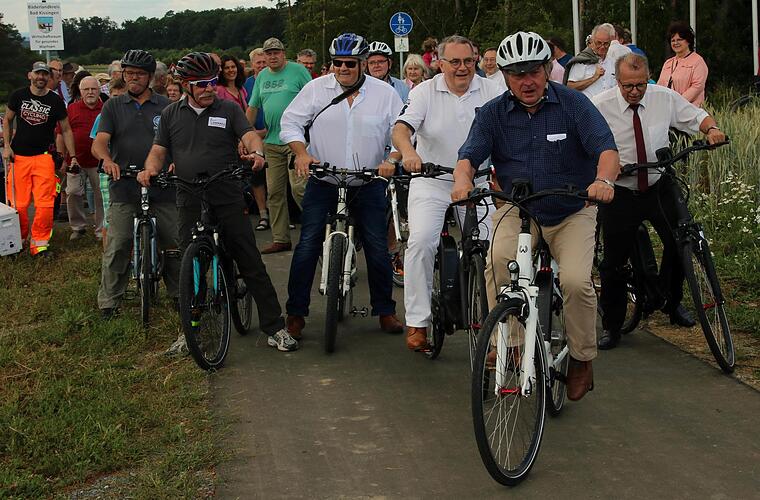 Staatssekretär Gerhard Eck, der Schirmherr der Veranstaltung, ging auf die unterschiedliche Finanzierung dieses Radweges diesseits und jenseits der Kreisgrenzen ein. "In Bad Kissingen holt sich der Landkreis das Geld für die Finanzierung der Radwege bei den Gemeinden über die Kreisumlage wieder" rechnete er vor. Unterfranken habe das am besten ausgebaute Radwegenetz in ganz Bayern.