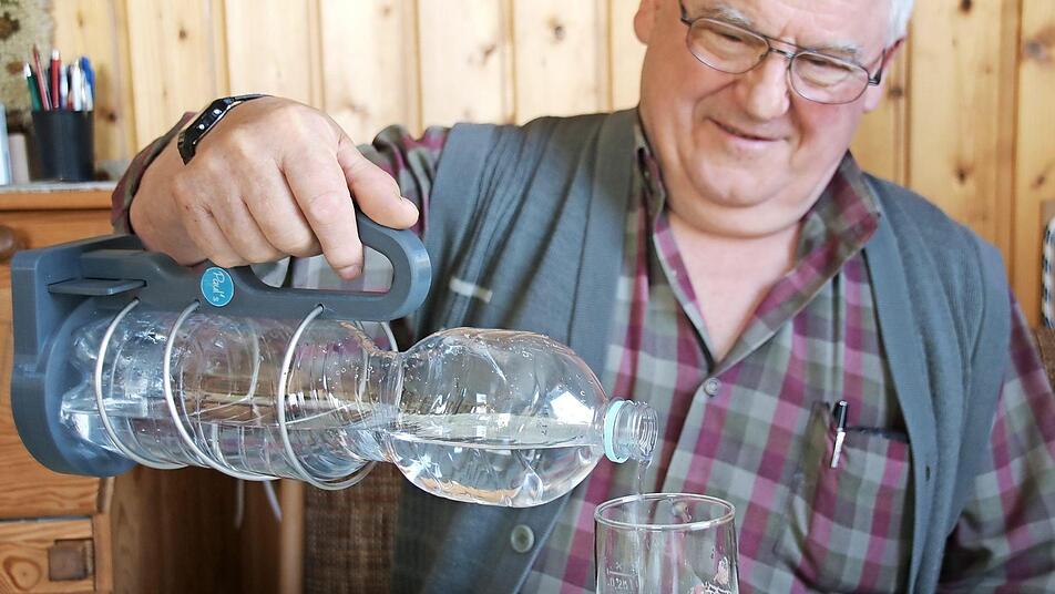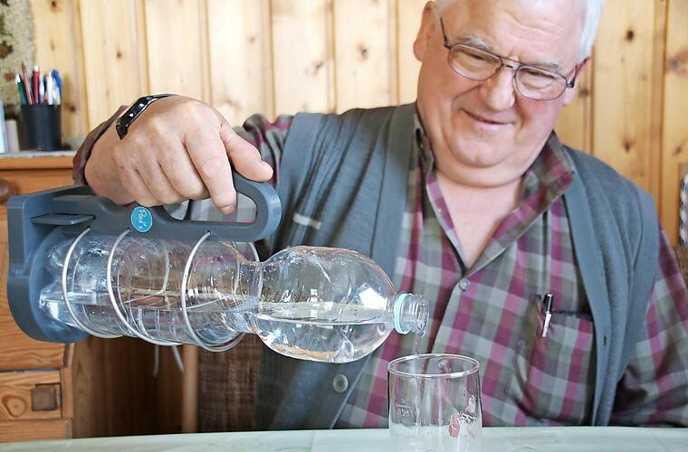 Eigentlich ist Paul Schmitt ein Fachmann für innovative Produktentwicklungen im Bereich der Garten- oder Forsttechnik. Mit seiner neuesten Erfindung begab er sich auf völlig neues Terrain.Er hat einen ergonomischen Flaschenhalter für PET-Flaschen entwickelt. Dank dieses Hilfsmittels können Plastikflaschen nur mit einer Hand aufgeschraubt werden. Gleichzeitig dient der Flaschenhalter dank eines Henkels als komfortable Einschenkhilfe.