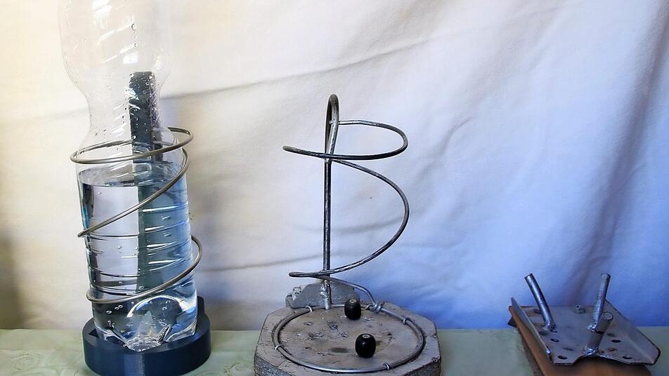 Besonders lange saß Paul Schmitt über dem Problem, wie die Plastikflachen sicher in der Halterung arretiert werden können. Ein Spannverschluss kommt bei PET-Flaschen nicht in Frage. Denn beim Öffnen verlieren die Plastikflaschen an Stabilität. Der Federkern einer alten Matratze brachte ihn schließlich auf die richtige Idee. Eine Spiralfeder hält jetzt die Flaschen in ihrer Verankerung. Nur für Glasflaschen funktioniert die Federhalterung nicht. Hier kommt der Spannverschluss zum Einsatz.