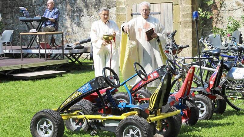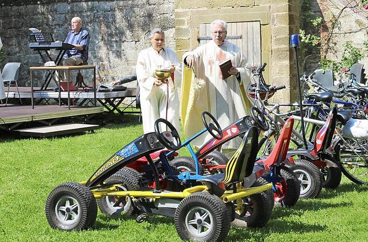 Im Kloster-Park zelebrierte Pater Gottfried Scheer SAC, der Hausgeistliche von Maria Bildhausen, den Gottesdienst mit Fahrradsegnung. Er stellte natürlich das Rad in den Mittelpunkt seiner Predigt und betonte, dass es schon vor mindestens 6000 Jahren von den Menschen erfunden worden sei. "Ein Rad dreht sich immer nur um sich selbst. Ein Mensch muss allerdings auch an andere denken", sagte Scheer. Es dürfe sich nicht alles um ihn selbst drehen, mahnte er die Gottesdienst-Besucher. Viele von ihnen hatten ihre Fahrräder mitgebracht, die von Scheer gesegnet wurden.