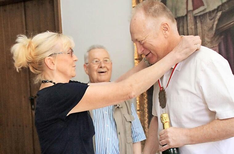 Der Ehrenpräsident des Fasnachtsverbandes Franken, Franz "Mecki" Binder (Feucht) überreichte Helmut Blank in der Münnerstädter Rathausdiele den Orden des Fasnachtsverbandes. Anlass war ein Jahrestreffen der Ehrenmitglieder im Deutschen Karnevalsverband.