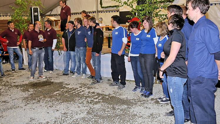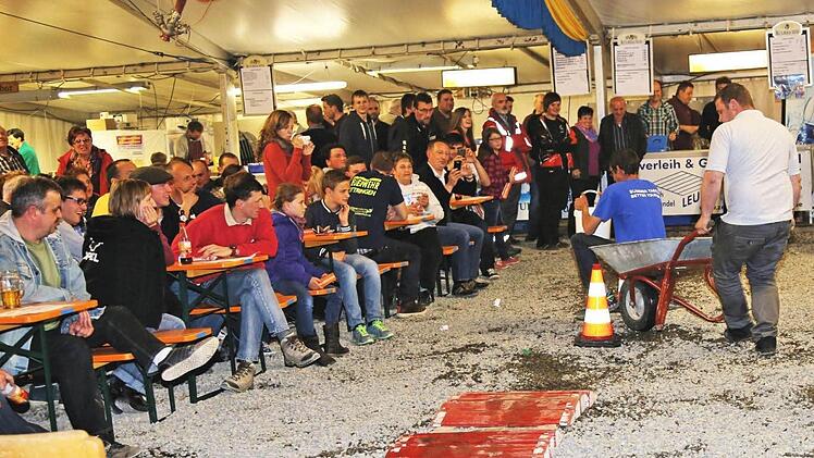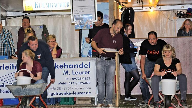 Feuchte Angelegenheit Eine sehr feuchte Angelegenheit für manche Mitspieler und eine besondere Gaudi für die Zuschauer wurde das letzte Spiel. Ein Mitspieler musste sich in einen Schubkarren setzten und bekam einen Eimer mit neuneinhalb Liter Wasser. Ein weiteres Mannschaftsmitglied musste ihn oder sie möglichst schnell über einen kurvigen und holprigen Parcours ins Ziel schieben, dabei durfte natürlich möglichst wenig Wasser verloren gehen. Die besten Mannschaften waren übrigens Rannungen II, Großwenkheim II und Keller Großwenkheim "Rest vom Fest". Sie wurden mit Pokalen und Gutscheinen belohnt.
