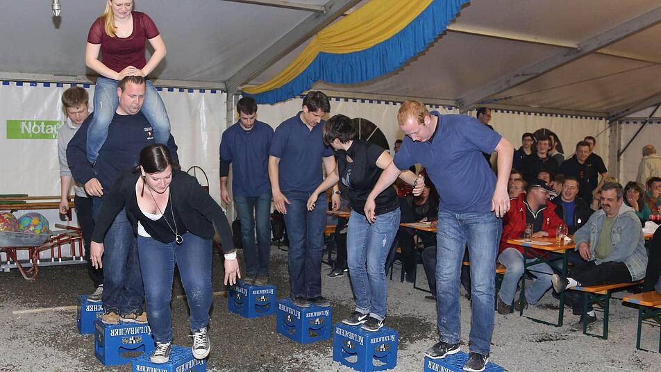 Zur Riesengaudi wurde der Bierkasten-Wettlauf, bei dem vier Teilnehmer auf vier Bierkästen fast die ganze Breite des Festzeltes überwinden mussten.