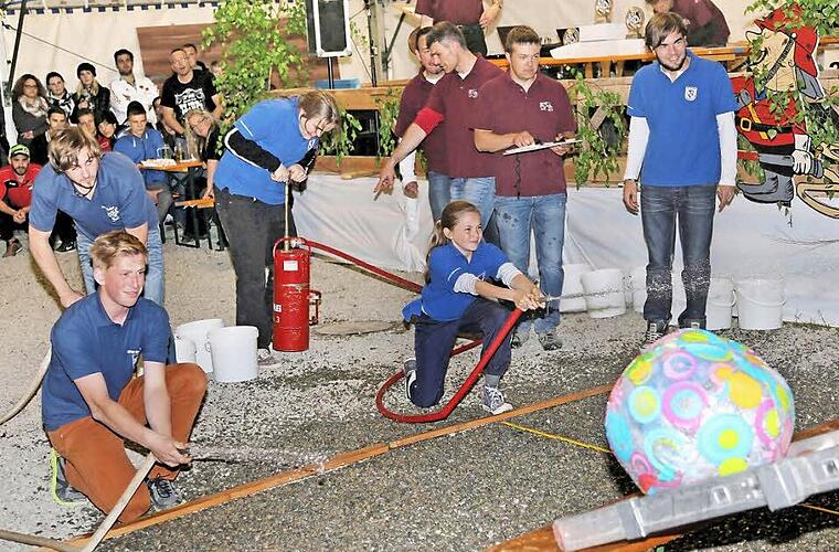 "Am Brandort ist es schon wichtig, dass die Schläuche nicht wild in der Gegend rollen" meinte dazu ein Feuerwehrexperte. Feucht wurde es dann beim Ziel-Spritzen. Es galt, mit einem kräftigen Wasserstrahl aus einer Tragspritze einen Wasserball eine schräg stehende Leiter hoch zu treiben.