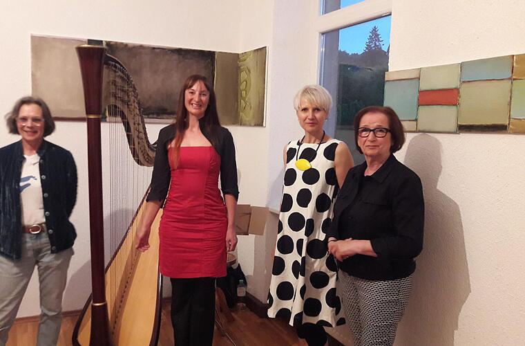 Feinfühlig und sorgsam führte sie die Zuhörer im voll besetzten Parkettzimmer des else!² Projekt-Gebäudes durch das Buch. Das Buch entstand von der Idee bis hin zur Verwirklichung und ebenso die Präsentation vor einigen Wochen im Kunstsalon in Schweinfurt, der beruflichen und privaten Heimat von Martina-Müller-Wagner und Linde Unrein. Beide sind Mitglied der Schweinfurter Autoren-Gruppe. Linde Unrein konnte nach der Lesung den Gästen in einem Künstlergespräch an den Originalzeichnungen die Beweggründe für die Motive erläutern. Sie ist mit ihren Arbeiten in der Ausstellung "abgefahren" vertreten. An Katharina Winterhalter und der Harfenistin Christine Eberherr lässt sich die Bedeutung Bahnhof als Haltestelle und Zwischenstopp gut beschreiben. Ohne "else!2" wären sie nie in
