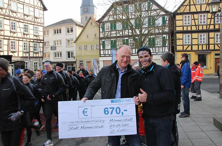 14 Teams, allesamt Mitarbeiter von Versicherungen, waren am Start und absolvierten einen Teil des offiziellen Braveheart-Parcours. "Blau direkt" hatte seine Versicherer zu diesem Lauf aufgerufen. Die Resonanz war so groß, dass man den Financial-Battle anbieten konnte. Unter ihnen waren nach Auskunft Pradettos auch Versicherungsvorstände. "Und alles ist privat finanziert", unterstrich er ausdrücklich. Mit im Gepäck hatte Oliver Pradetto die Spende, die er an Bürgermeister Helmut Blank überreichte. Dieser erläuterte, dass mit dem Geld Reiztherapien finanziert werden sollen, die den Behinderten sehr gut tut, aber nicht im Leistungsumfang der Kassen liegt.