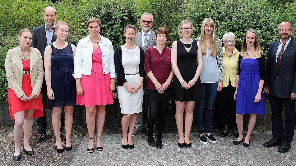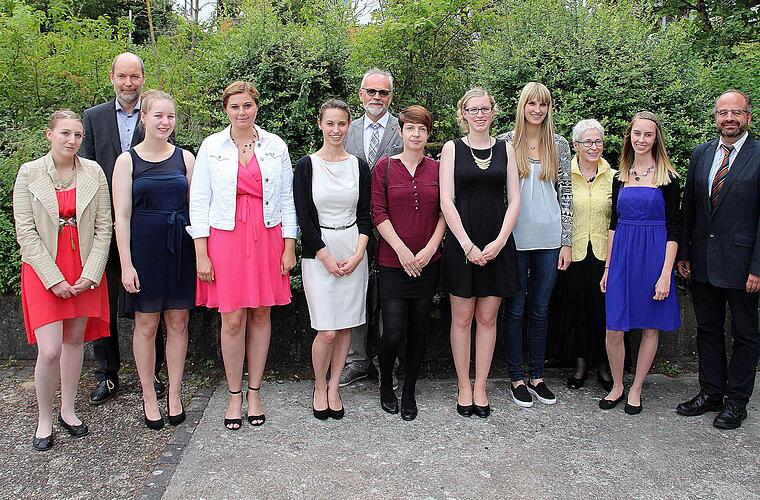 Die Einser-Absolventen Lisa-Marie Leitschuh (Note 1,0 - Berufsfachschule für Sozialpflege), Anna-Lena Groß (1,13), Veronika Rost (1,26), Corinna Schubert (1,40), Daniela Jeß (1,40 - alle BFS Kinderpflege), Miriam Seifert (1,55 (BFS Sozialpflege), Anna-Lena Sauer (1,57) und Vanessa Bauer (1,71 - beide BFS Ernährung und Versorgung).
