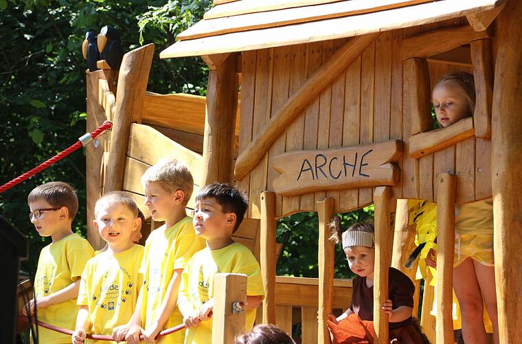 Stadtpfarrer Pater Markus Reis segnete das große Spiel- und Kletterschiff, ehe die Buben und Mädchen des Kindergartens die Arche als Kulisse für ihre Aufführung nutzten. Passend dazu erzählten und sangen sie die Geschichte des frommen Noah, der ein Schiff baut, und damit seine Familie und viele Tiere vor der Sinnflut rettet. Zahlreiche Eltern und Verwandte der Kinder verfolgten die Darbietung und spendeten reichlich Beifall.