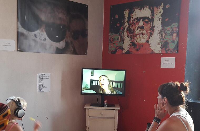 Zwei Räume besetzt Milli Genth mit Technik und Sitzgelegenheiten. Das Verweilen ist Pflicht, wenn der Genuss ihrer Kunst ankommen soll. Außerdem fallen die großformatigen Screenshots ins Auge, die voll aus dem Leben gegriffen, mitunter gerade durch die Unschärfe auf sich aufmerksam machen.