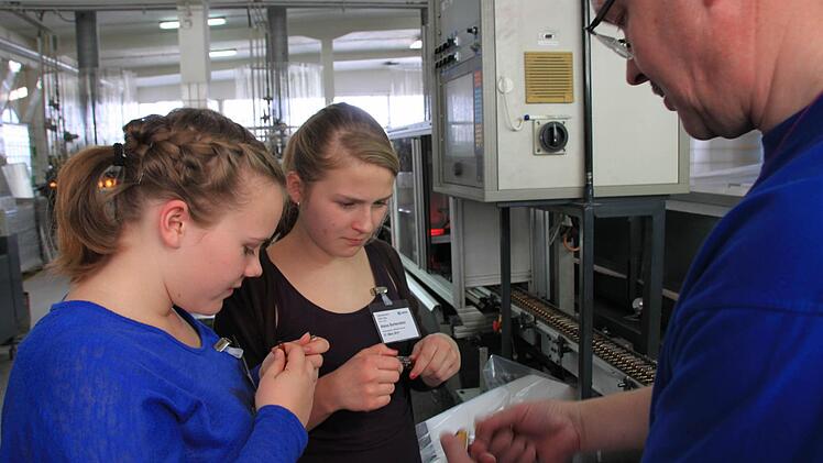Karin Klein gehört zu den beiden Mitarbeiterinnen im Haus, die diese Gläser bedrucken. An diesem Tag hat sie Hilfe bekommen. Zwei Schülerinnen des Schönborn-Gymnasiums durchlaufen bei ihrem Girls' Day auch diese Abteilung im Betrieb. Hier können Julia Ziegler und Alexa Bartenstein selbst Hand anlegen und produzieren mit eigener Hand Erinnerungsstücke an ihren Girls' Day bei Nipro.