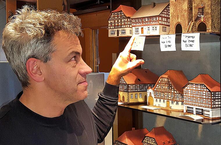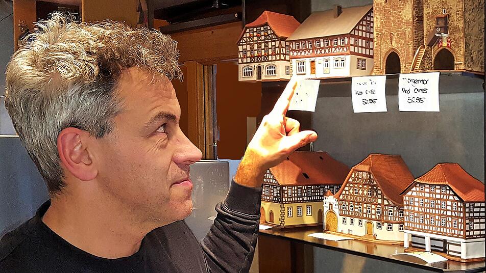 Das Hiller-Haus ist für ganze 22,95 Euro zu haben, das Heimatspielhaus für 54,95 Euro und die Löwen-Apotheke für 63,95 Euro. Das alles klingt nach Ausverkauf in der Stadt, aber so schlimm ist es nicht. Diese Preisangaben hängen nicht im Schaufenster eines Immobilien-Händlers oder der Sparkasse in der Ramsch-Ecke, sondern zum Glück nur in einem Regal von Eisen-Krais direkt am Eingang des Ladenlokals. Arno Reuscher vertreibt in seinem Laden seit fünf Jahren Modelle historischer Münnerstädter Gebäude aus Keramik, die in einer kleinen Keramikwerkstatt in Litauen gefertigt werden. Rechtzeitig zum Weihnachtsgeschäft kamen drei neue Häuser dazu: das Gasthaus Bären auf dem Marktplatz, das Stadtbild prägende Schuhhaus Moritz sowie das total renovierte Kropfeldhaus am Anger.