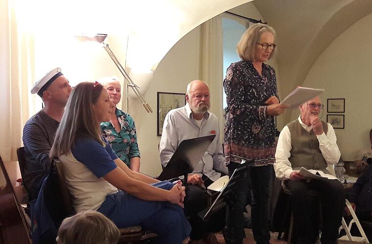 Zuerst waren es die ehrfürchtig-staunenden Musiker, dann kurze Sekunden später das in den Gesang einfallende Publikum, welches es dem Interpreten leicht machte, die Einsätze in die Melodie richtig zu setzen. Bereits vorher konnten die Gäste im fast voll besetzten Deutschherrnkeller die Zähne der diesmal besonders gut aufbereiteten Literatur-Choreografie von Bärbel Fürst erkennen. Die dann auch dank eines langen Schauspielerlebens von Jens-Müller Rastede sich in kurzen Spielszenen austoben konnte. Rastede, der natürlich seine Dialektik einbringen konnte, ließ in der Komik kaum ein Auge trocken. Das gelang dem musikalisch-literarischem Ensemble diesmal ganz besonders. In sprichwörtlich, schäumenden, manchmal sonnig plätschernden Meereswellen kamen die Beiträge daher. Dem Publikum wurde salzig um den Mund, wenn es Texte von René Goscinny, (Asterix und Obelix) hört, der seine familiären Erfahrungen mit Schiffsreisen von Argentinien nach Frankreich als Kind und Jugendlicher einordnete in "Tänzerschiffe" Spielerschiffe," Trinkerschiffe und Beischläferschiffe", wobei sich fließende Übergänge natürlicherweise ergeben haben. "What shall we do with the drunken sailor", sangen dazu Milli Genth, Sabine Häring und Detlev Beck, samt dem Gästechor.