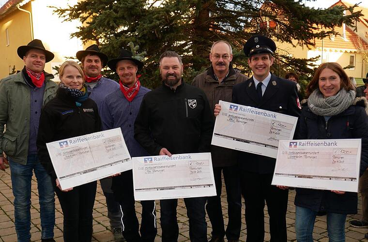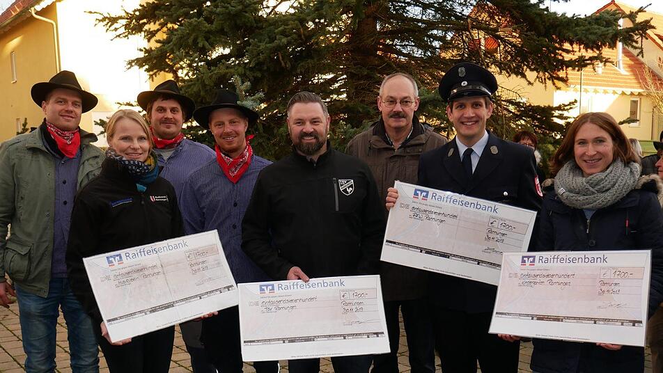 Die Aktionen des Planvereins haben darüber hinaus meistens einen wirtschaftlichen Gewinn erbracht, der auf den Helferfesten alleine nicht aufgebraucht werden konnte. So ist in den vergangenen zehn Jahren die stolze Summe von 6800 Euro übrig geblieben. Zum letzten Male stellte also in diesem Jahr der alte Planverein den Christbaum in der Ortsmitte auf und die Rannunger waren zahlreich erschienen, um die 63 Planpaare von 2010 zu verabschieden und die Scheckübergaben mitzuverfolgen. Jeweils 1700 Euro konnte Vorsitzender Matthias Leurer an Vertreter der Feuerwehr, des TSV Rannungen, des Musikvereins Rannungen und des Kindergartens übergeben. Dann übergab er das Wort an seinen Nachfolger Lorenz Zehner, der von 52 Planpaaren berichtete, die sich für das Fest 2020 angemeldet haben. Der neue Planverein war schon im Frühjahr diesen Jahres gegründet worden und die Mitglieder seien schon voller Vorfreude. In eigens anberaumten Tanzstunden werden nun traditionelle fränkische Tänze bis zum Fest einstudiert.