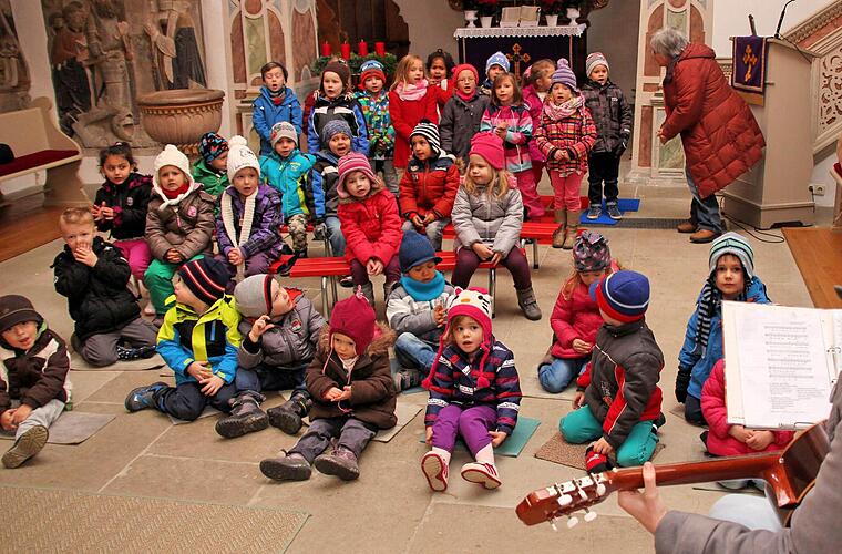Dann aber ging die Generalprobe richtig los. Mit ihren hellen Stimmen sangen die die Buben und Mädchen als Einstimmung "Alle Jahre wieder kommt das Christuskind", "Lustig, lustig trallallala, bald ist Nikolausabend da" und "In der Weihnachtsbäckerei gibt es manche Leckerei".