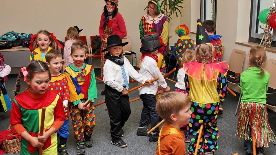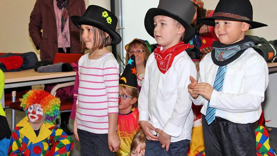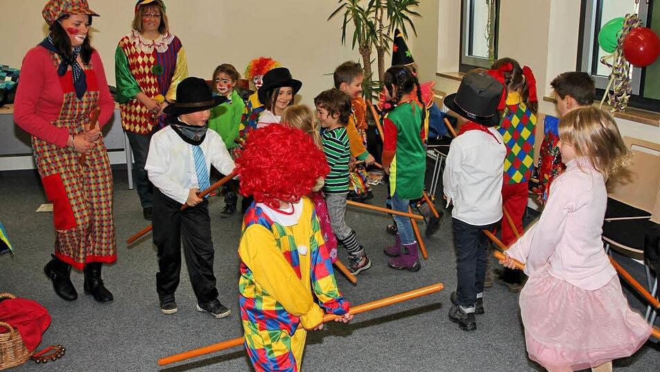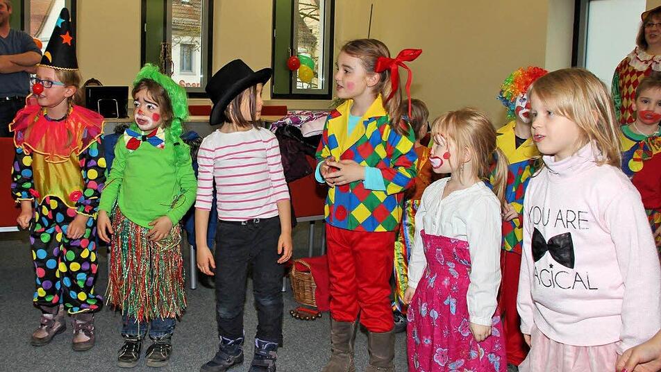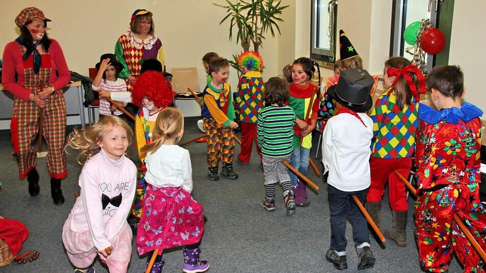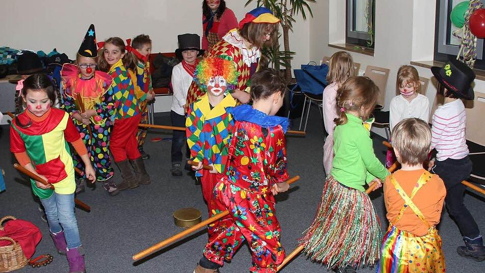Die Kindergarten-Kinder waren zumeist sehr schön als Clowns maskiert. Sie führten einen Fische-Tanz vor und flogen mit ihren Hexen-Besen durch den Rathaussaal. Zum Gassenhauer "Da steht ein Pferd auf'm Flur" zogen die Kinder und die Rathaus-Mitarbeiter in einer Polonaise durch den Raum.