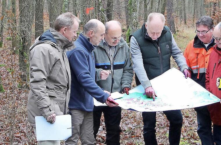 Bürgermeister Helmut Blank, Jörg Mäckler (Chef der Forstbetriebsgemeinschaft Fränkische Rhön), Bernd Zürner (Amt für Ernährung, Landwirtschaft und Forsten in Bad Neustadt), Arnim Otter (Amt für Ernährung, Landwirtschaft und Forsten in Würzburg, koordinierende Stelle für Forsteinrichtung und Standorterkundung in Unterfranken), der Forstsachverständige Markus Schömig und auch die beiden Stadträte Bruno Schäfer und Klaus Schebler trafen sich zu einer Vorbesprechung im Rathaus und sahen sich im städtischen Wald um.
