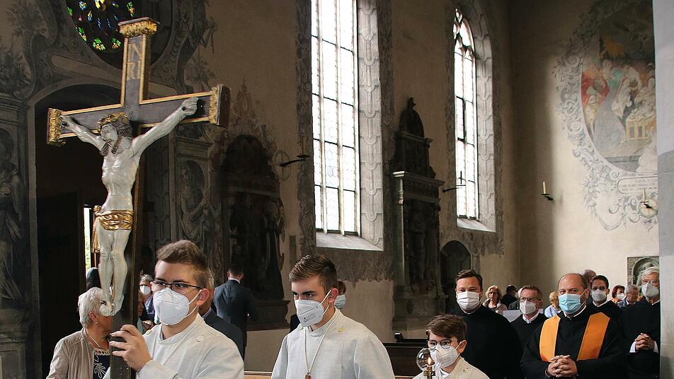 Nach dem feierlichen Einzug vom Pfarrhaus in die Kirche begrüßte Stadtpfarrer Pater Markus Reis OSA die Gäste in der bis auf den letztmöglichen Platz besetzten Kirche - "mehr geht wegen der Corona-Vorschriften leider nicht". Neben den Augustiner-Mitbrüdern aus Münnerstadt konnte er auch Abordnungen aus den Klöstern in Würzburg und Maria Eich willkommen heißen. Sein ganz besonderer Gruß galt natürlich seinem Mitbruder Pater Christian "in der Stadt, in der du zu Hause bist, in der du zur Schule gingst, in der du Ministrant warst".