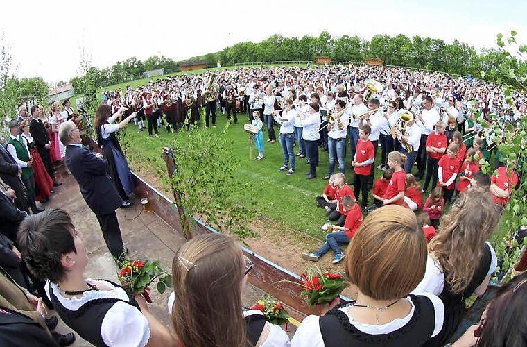 Die Musikvereine versammelten sich anschließend auf dem Rannunger Sportplatz zum Gemeinschaftschor. Rund 1000 Musikerinnen und Musiker spielten gemeinsam mehrere Stücke, darunter die Bayernhymne und das Deutschlandlied - und das so gut, als hätten sie vorher ihren Auftritt zusammen geübt.