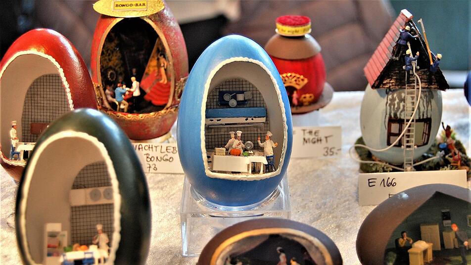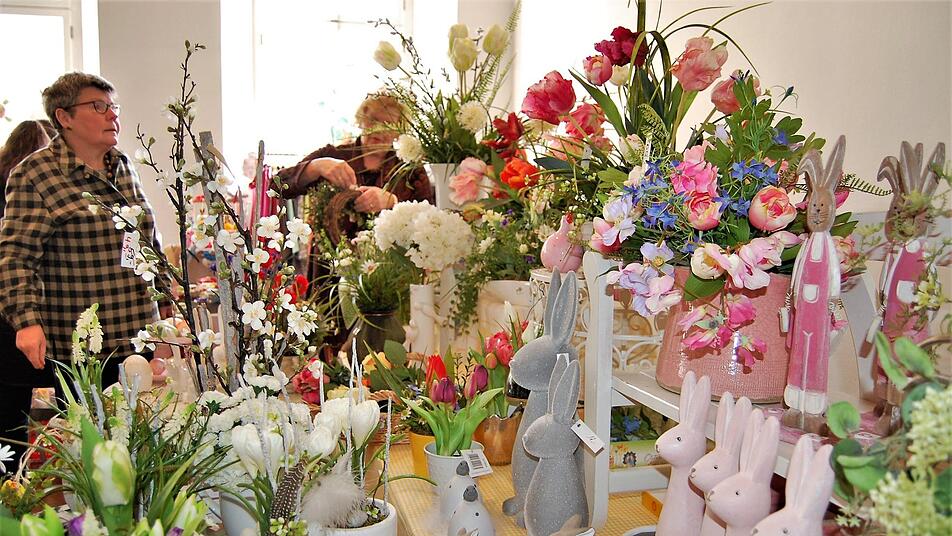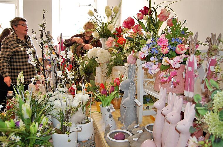 Gleich beim Betreten der Alten Aula wurden die Besucher von bunten Frühlingsblühern, aber auch österlichen Deko-Artikeln auf die kommenden Festtage und die wärmere Jahreszeit eingestimmt. Daneben gab es vielerlei Handgefertigtes, ein ganzes Sammelsurium aus Osterhasen und Osterküken. Faszinierend waren die bemalten Eier in verschiedenen Größen oder die mit unterschiedlichen Szenen ausgefüllten Eier. Ein Hingucker war auch die kleine Szene auf der Bühne mit großen Hasenfiguren, die dem erstmals 1924 erschienenen Kinderbuch-Klassiker "Die Häschenschule" nachgestellt war.