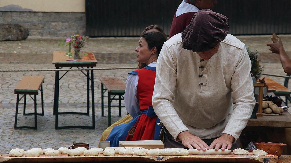Zu einem richtigen Lagerleben mit Kämpfern gehört natürlich auch die Verpflegung der Mitwirkenden. "Ohne Mampf kein Kampf" heißt es bekanntlich in jeder Truppe. Da wurden in einem altertümlichen kleinen Ofen Brötchen über offenem Feuer gebacken, in einer Pfanne auf einem Schwenkgrill brutzelte Gemüse oder in einem Topf, der an Ketten über brennenden Holzscheiten hing, wurden Würste heiß gemacht. Von alldem bekamen die Zuschauer allerdings nichts ab. Die mussten allerdings auch nicht hungern oder verdursten, denn rund um das eigentliche Landsknechtslager, das mit Seilen abgetrennt war, gab es ausreichend Verpflegungsstände.
