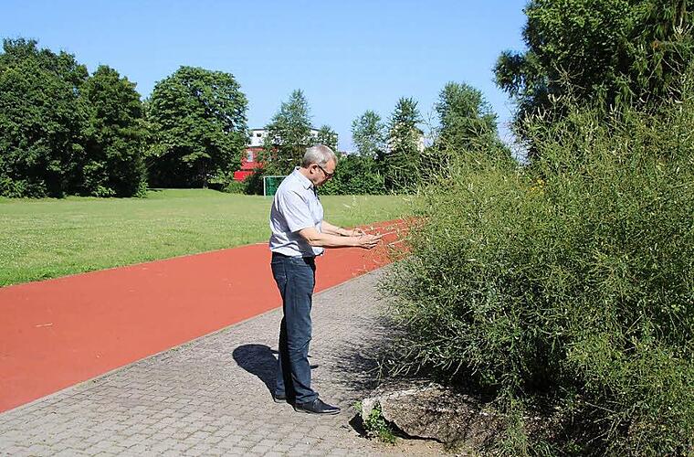 "Da war ich auch schon an der Schule", erinnert sich Joachim Schwigon, heute Schulleiter am Schönborn-Gymnasium. Er weiß sofort, wo das Schwimmbecken war. "Die Randsteine sind noch die gleichen." Wo früher die Schülerinnen und Schüler ihre "Leibesübungen" absolvierten, stehen heute Pflanzen. In der Mitte ist noch immer ein Tümpel, an dem Schilf wächst.