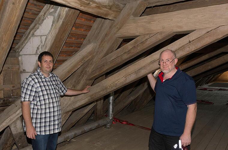 Bis es aber so weit ist, heißt es erst einmal die Balkenkonstruktionen näher in Augenschein zu nehmen und sich die Details erklären zu lassen. Hierfür haben sich die beiden fachliche Hilfe geholt: Bei der Erkundungstour ist Zimmerermeister Christoph Hein mit von der Partie. Auch für ihn ist das Gebälk der Zehntscheune beeindruckend.