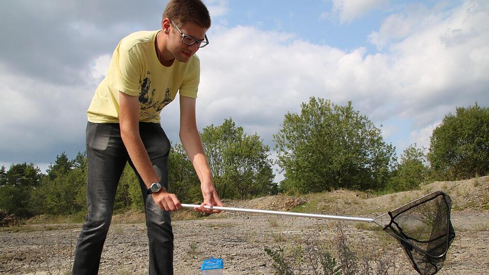 Es ist heiß, die Sonne scheint vom Himmel. Beste Arbeitsbedingungen für Matthias Franz aus Seubrigshausen. Der angehende Umweltingenieur schreibt eine Forschungsarbeit über ebenso unauffällige, wie seltene Landkreisbewohner: Es handelt sich um die rotflügelige Ödlandschrecke und die italienische Schönschrecke. Beide Heuschreckenarten werden aktiv, wenn das Thermometer am höchsten steigt.