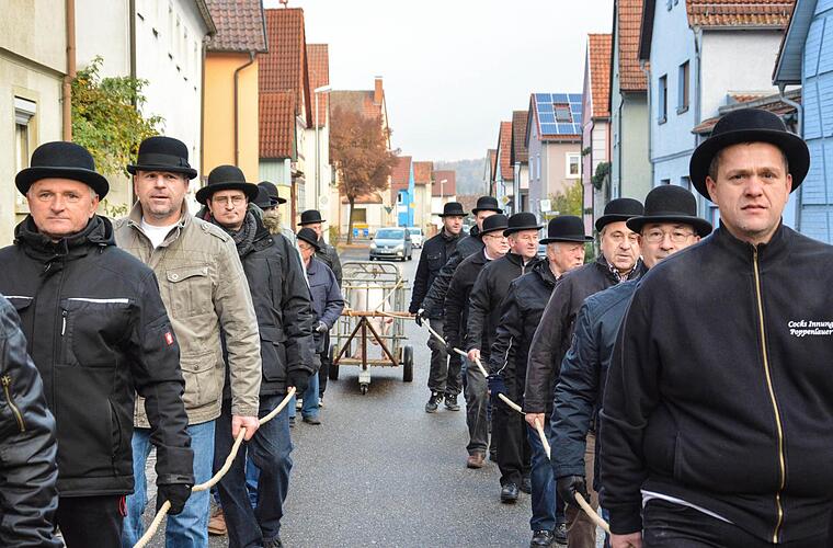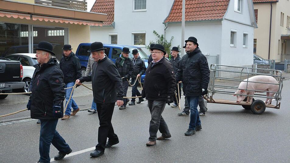 Die "Cocksinnung" zelebriert den Brauch, nach der Kirchweih ein Schwein feierlich zum Schlachter zu bringen - und es natürlich später zu verspeisen.