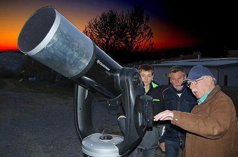 Solche Veranstaltungen stehen und fallen mit dem Wetter, und das war am Samstagabend einfach ideal. Die Sterne funkelten hell am wolkenlosen dunklen Himmel, denn der Mond war zum Glück schon am Vormittag um 11.12 Uhr untergegangen. Die "Mords-Kanone", die Werner Krauß zum Astronomie-Tag mitgebracht hatte, ist ein Schmitt-Cassegrain-Spiegelteleskop. Der Hauptspiegel, der als Objektiv dient, hat einen Durchmesser von 23 Zentimetern und eine Brennweite von 2,35 Metern. Ein Linsenfernrohr hätte ein wenig mehr als diese Länge, wäre also schwer zu handhaben und zu transportieren. Im Schmitt-Cassegrain-Teleskop jedoch werden die Lichtstrahlen hin und her reflektiert, wodurch die Baulänge ganz wesentlich verkürzt wird. Dieses Teleskop kann noch auf einem Pkw-Anhänger transportiert werden. Für sein Teleskop mit einem Spiegeldurchmesser von 40 Zentimeter, das in seinem Heimatdorf Rödelmaier stehen hat, gibt das nicht.