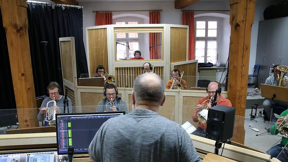 Es ist ein Wiedersehen. In den Räumen der Städtischen Musikschule Münnerstadt in der Zehntscheune haben viele der Blaskapellenmitglieder ihre ersten musikalischen Gehversuche unternommen. Inzwischen sind rund die Hälfte von ihnen Berufsmusiker, die anderen hochkarätige Hobbymusiker, die alle eins gemeinsam haben: Die Liebe zur Musik von Ernst Mosch und seine Original Egerländer Musikanten. Im großen Raum der Musikschule, dort wo die Ensembles und Orchester proben, nahmen die Eghalanda Musikanten nun ihre erste CD auf. Möglich geworden ist dies, weil Manfred Heiß aus Türkheim im Unterallgäu nicht nur Dirigent des Münnerstädter Blasorchesters ist, sondern auch ein eigenes Tonstudio hat. Das brachte er nach Münnerstadt mit und verwandelte drei Tage lang den Orchesterraum der Städtischen Musikschule in ein professionelles Aufnahmestudio.