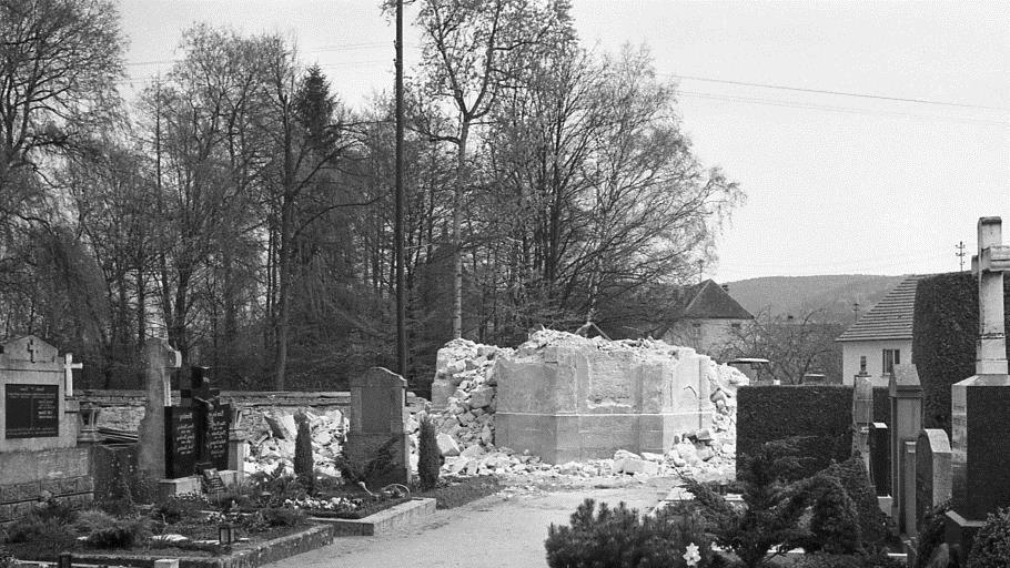 1967 wurde die Friedhofskapelle abgerissen. Sie war erst 1875 an der Stelle eines uralten Vorgängerbaus errichtet worden. Das Betonzeitalter ließ grüßen.